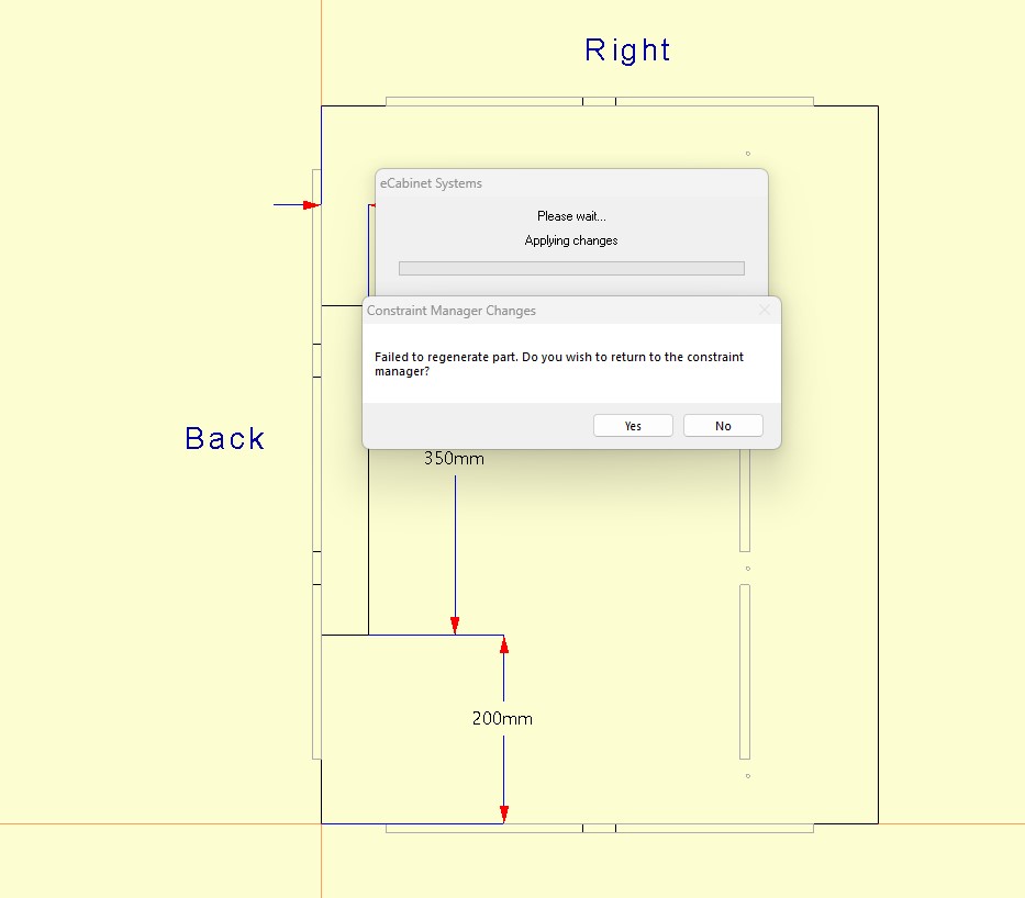 Once you go past the self intersecting constraints sizes (the cabinet size where the constraints limit the cabinet size), you get error messages and it becomes corrupted.