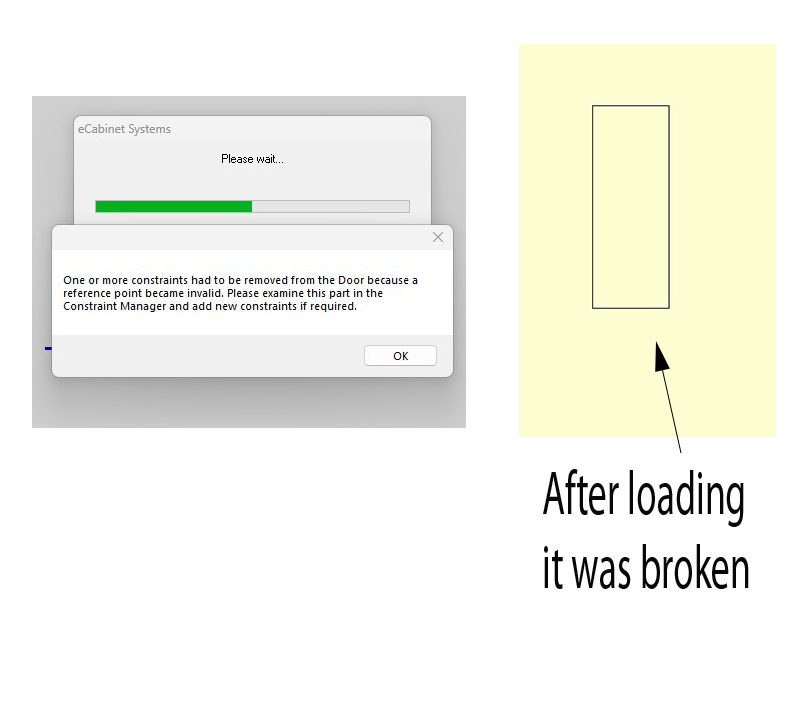 this is very frustrating because it seems like that also causes minor bugs like constraint manager constraints lose a reference point and sometimes deletes the part edit cuts entirely, this is also happening when i part edit a door from the cabinet editor but i'll be showing pictures from the design tab- door/drawer editor down below