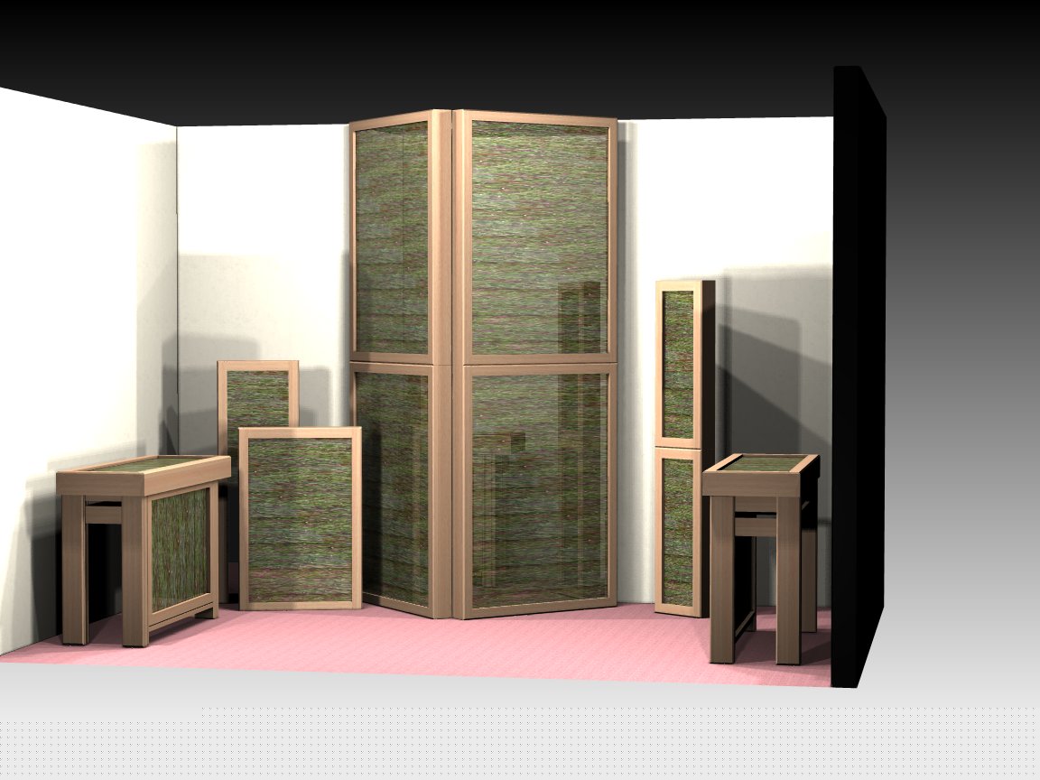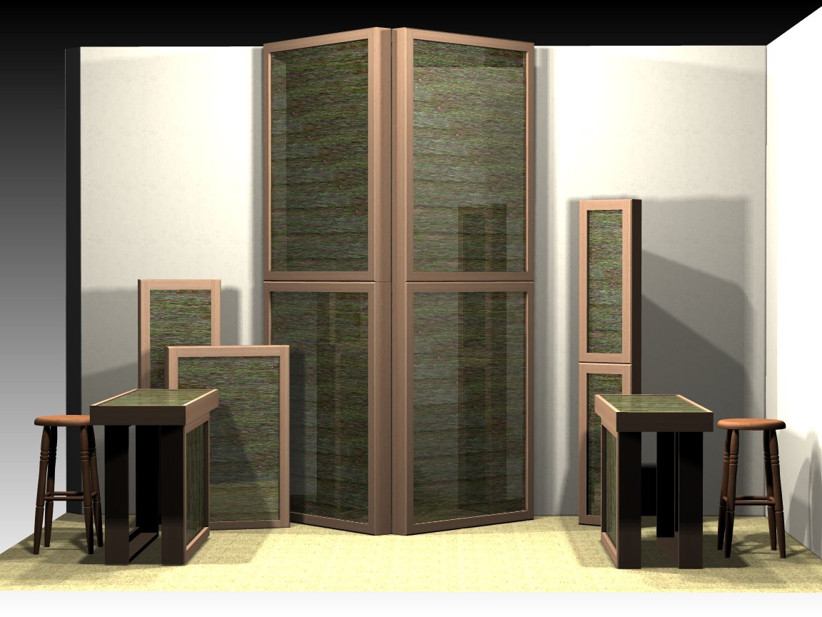 This is a design I'm currently working on for a client. It is pretty much a rendering of what he sketched out. The display cases will hold what is basically a salad mix that his company sells. The salad mix will be about 1 1/2\" thick in each case. The exteriors of the cases will be made of vertical solid amber bamboo plywood material. The faces are all 1/4\" plexiglass.