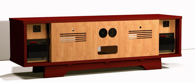 It's designed as RTA and meant to have casters underneath to easily move unit away from wall and back for wiring/a/v component access. I had a audio engineer friend help me with speaker selection and sub port cab design. Basically you have left, center and right front channel speakers with two down firing subwoofers. Each of the subwoofers have their own individual amps. There is a double fan unit that would draw fresh air through the bottom vents and push out the back. Back panels are drilled for quick turn release connectors and have plentiful wire access. Door design needs work. Intent was to have wood case and solid color gloss lacquer fronts. The color of lacquer would be chosen to get a match with speaker cloth of the L,C,R speakers so everything blends together and the speakers don't punch out visually. Touch latch doors and touch latch tape/disc drawer under the center speaker. False fronts under L&R speakers because those are the subwoofer enclosures. Spent a considerable time laying out the design as per what's required to handle adequate a/v components and then drafting in eCab.